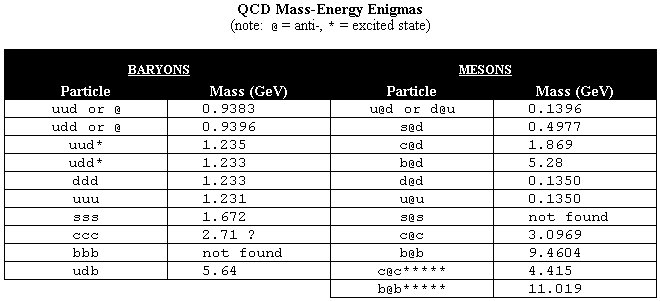 Mass is QCD's Achilles heel. There is no direct way to weigh a quark, because quarks are assumed never to be found in isolation. Rather, quarks are presumed to exist only as sub-components of larger hadron entities classified into two varieties, mesons and baryons. Since the quark components and accurate masses of dozens of particles and resonances are known (i.e. have been assigned), it would seem to be an easy problem to extract the quark masses from this data, but, alas, there are complications! I give a few examples below, to illustrate the problem:
