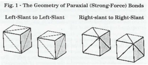 ഀ ഀ ഀIt should be clear, at this point, that the two c-voids of a defect-pair must have opposite "slants" for cancellation of E/C distortion to take place. And, this makes it quite clear that bonds between two co-linear defect-pairs in two nucleons spaced-apart on a common plane, must have the same slant forms, if their opposing c-voids are to have the required opposite slants for bonding. IPP calls this bonding configuration between two defect-pairs, a "paraxial bond". There are two equally probable slant relationships of paraxial bonds: left-slant to left slant, and right-slant to right-slant. I use the "cube" form of nucleons to show these slant relationships, below: