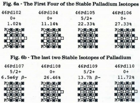ഀ ഀLet us see if we can discover the structural feature below in Fig. 6a that would induce neutron movement, when a D bonds. A clue staring us in the face is the different look of the one odd-n isotope, 46Pd105, compared to the three even-n isotopes. It has only three neutron three-stacks in the central row vs. four for the even. Then looking closer we see that it has two more 2/4 neutrons in the second column, than does 46Pd106 to its right. Ah-ha!, we say, neutrons move back and forth between the central row and the second column as the number of neutrons, A-Z, changes from even to odd: