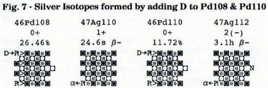 The relevance of our observation about neutron movement between even-n & odd-n isotopes is that when a deuteride adds to an even-n palladium isotope it changes it into an odd-n isotope of silver. Thus, we will expect the three neutrons in the right three-stack in the central row to move into the second column, and to add to however many neutrons are already there. This makes it easy for us to chose a palladium isotope that fulfills our requirements for alpha emission --- we need only look for an even isotope that already has four (or more) neutrons in the second column before the deuteride adds. Looking at the structures directly above, we see that both 46Pd108 & 46Pd110 satisfy this requirement. Let us look at these before and after D bonds to them: