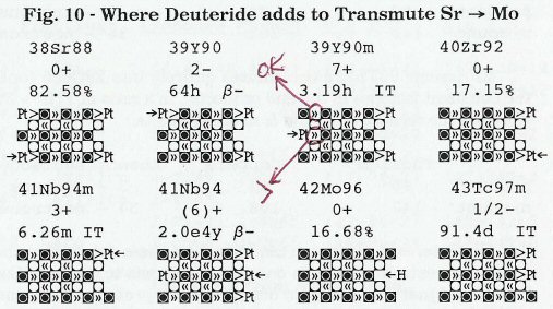 ഀ ഀ ഀI will assume for this demonstration that you have studied the Cs → Pr example, for I shall not make a tally of bonds to justify my choice of where the deuteride adds. I think you will perceive that adding to either of the left column proton two-stacks will yield one more proton and one more neutron paraxial bond (because of the proton three-stack, and 2/4 neutron two-stack, midway between them) than adding to the right column two stacks, where these nucleons are missing. Also, I'm sure that you see that deuteride addition must stop when 42Mo94 is formed, because there is no suitable bonding site present on that structure for the D neutron. A proton could add in the location indicated by "←H", but this has the same difficulty (lack of a suitable hydrino H-catalyst) as adding a proton to 59Pr141, and the same remedy (provide one).
