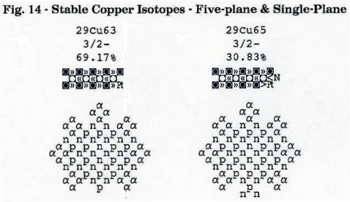 ഀ ഀIf these two stable copper isotopes form in the manner I have suggested, we must conclude that the 11 extra protons that attach to the central 18-proton group will be very hungry for neutrons, since 34 & 36 neutrons are needed to form the neutron "saturated" structures I show below. Hence, these protons must grab most of the neutrons that reside in the two columns that are to the right and left of this center group. Here, then, is the answer to the last of my mystery questions below Table 6. Incidentally, the single-plane structures for copper, below, could very likely not sustain all the alpha groups shown, because they are too much surrounded by nucleons in the six-state charge-exchange. If these alpha groups revert to six-state, the total mass-deficit would be substantially less. Here is another reason to prefer the five-plane structures.
