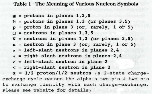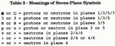 ഀ ഀThe geometrical relationships that prevail between the nucleons of the five planes permit us to represent the exact location of all the nucleons in a five-plane cluster of nucleon with a single plane of appropriate symbols. These symbols are of two types: one group represents the nucleons in either one, two, or all of the three planes, 1/3/5, which, as I have already explained, are composed of diagonally alternating protons & neutrons, much like single-plane nuclide structures. A second set of symbols is designed to show the locations of neutrons in either, or both, of the two all-neutron planes, 2/4. These are chevron symbols which have an additional function, that of showing the specific T-slant direction of each neutron in these two planes. With this 2/4 slant information you will be able to infer the slant directions of the protons and neutrons in planes 1/3/5. It is only necessary to remember that the slant of the "notch" neutrons of planes 2/4 are required to be opposite to the slant of the "notch" protons of planes 1/3/5.