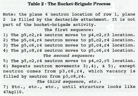When the D adds to the upper left-hand proton two-stack, and the resulting excited state induces an immediate internal transition, we may expect that greater bonding now accrues to the plane 4 locations in column 2, than in the right-hand three-stack of the central row. This causes the 1/3/5 neutrons of the central row to move into these vacant plane 4 locations of column 2 by a process I call a "bucket-brigade". We can imagine the process something like this:ഀ Let's look at 46Pd108 to describe this "bucket-brigade" process.
