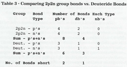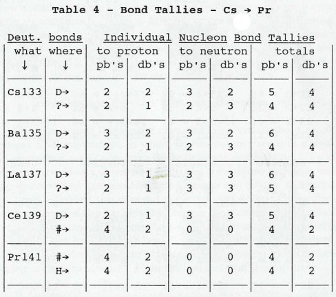 ഀ ഀI'm certain that many of you won't need to study Table 4, below, to be assured that I have chosen the most appropriate deuteride addition locations in the nuclear transmutation series of Fig. 9. However, in deference to readers whose minds prefer their decisions to be based upon quantitative data, I have compiled the bond tallies for both the D→ addition, and for the ?→ addition. You will note that the total bond count of D→ exceeds that of ?→ for each nuclide. Thus we may presume that the mass-deficits of the D→ additions exceed those of the ?→ additions, and will, therefore, be the deuteride attachment points for the transmutations shown.