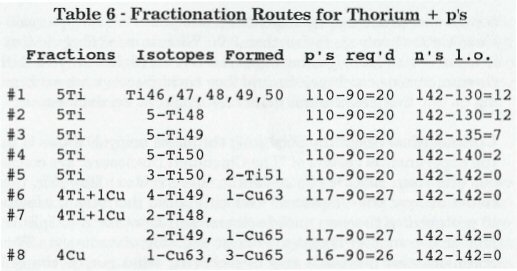 I show various ways that thorium with various numbers of attached protons can fractionate into titanium and copper in Table 6. The heading, "n's l.o.", means "neutrons left over" (i.e., the residue of 90Th232's neutrons that weren't utilized in forming the indicated isotopes). Only #5 → #8 would result in no emitted neutrons, although #1 → #4 could form without detected neutrons, if arriving neutral hydrinos combine with them to form deuterium.